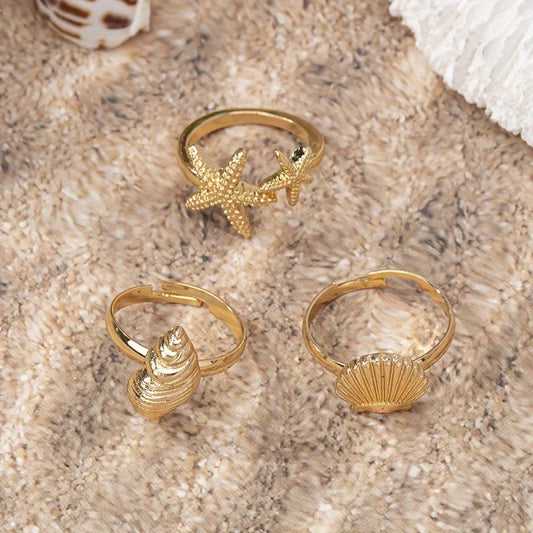 Conjunto de 3 Anillos Dorados Concha Estrella y Caracola